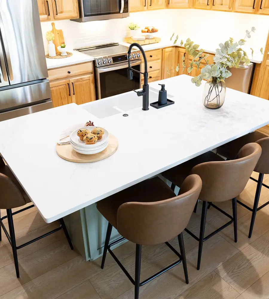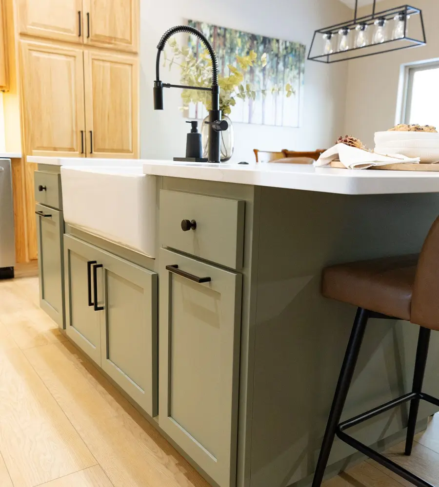 The cabinets were faded, the hardware old, the flooring ugly, and the island didn’t match their needs anymore.